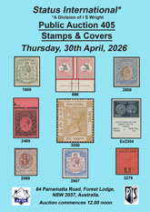 Public Auction 405Thursday, 30th April 2026 (12:00 noon) Buyers Commission 22% Catalogue for auction 405 stamps & covers is now available. Please click here to view online. Download in word or pdf format click here. |