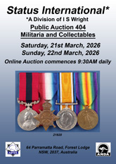 Public Auction 404 Saturday - Sunday, 21 - 22 March 2026 (9:30am) Buyers Commission 22% Catalogue for auction 404 Militaria & Collectables is now available. Please click here to view online. Download in word or pdf format click here. |