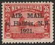 1921 Halifax Airmail 35c red, 2½mm spacing between 'AIR' & MAIL', variety no stop after 1921 & 1st '1' of 1921 below F of Halifax, on cover, tied by wavy lines pmk & 'ST JOHNS NFDL NOV 26 1921' cds, b/s 'Halifax FEB 4 1922' cds & slogan. VFU. SG 148b cat £275+ as loose stamp alone & 'from x2' on cover. Unitrade C3d cat C$700 on cover. (P)