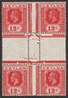 1921-32 KGV 12c rose-scarlet se-tenant Die I & Die II gutter blk of 4, 'heart of sheet', wmk script. Superb fresh MLH/MUH. SG 347b cat £320++ for M prs, plus premium for such cross gutter blk which occurred only once per sheet. (P)