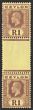 1921-32 KGV 1R purple on yellow vertical gutter Die I & Die II se-tenant pr, wmk script. Stamps VF fresh MUH. SG 354b cat £400 for M, should be at least double, £800 MUH. (P)