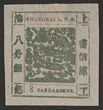 Shanghai: 1865 Large Dragon 8ca olive-green, antique numerals, with value 'CANDAREENS', on thin wove paper. This is the 1st issue in China being a post opened by foreign merchants, serving Shanghai & the other cities open to foreign trade. Superb fresh UN, 4 large margins. Scott 3 cat US$650. SG 4 cat £750. Rare genuine. Exp twice, while certificate can be obtained on request. (P)