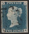 1840 QV 2d pale blue, no lines, plate 1, letters MB. VFU, 4 margins, red Maltese Cross pmk. Scott 2a-pl1 cat US$1450. SG Spec D51. SG 6-pl1 cat £1250. (P) |
