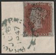 1841 QV 1d red-brown on blued paper letters OG. VFU, 4 margins on piece tied black obliterator & green town pmk. SG 8a cat £3250 for green pmk. (P) |
