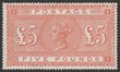 1867-83 QV £5 orange, letters DI, white paper. VF fresh MLH, nice original gum & beautiful bright colour. Scott 93 cat US$14,500, SG 137 cat £12,500+. Very rare in genuine mint condition as very few collectors could afford to buy such a high denomination stamp (=5 gold sovereigns!). Iconic Great Britain QV stamp & certificate can be obtained on request. (P) |