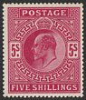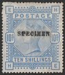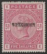 1883-84 QV 5/- crimson, letters EE-EE, on white paper, opt SPECIMEN (SG type 9). VF fresh M. Scott 108b(S). SG Spec K12 t. SG 181s cat £450. (P) |
