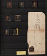 Postal History: 1841-68 covers etc with 1841 franked QV 1d black plate 1b tied by black Maltese Cross pmk to Edinburgh with 'St Andrews red b/s' (£750 on cover). 1854 part letter franked QV embossed 1/- to Tasmania with 'Launceston 8 SP 1854' arrival b/s. 1850s 1d red-brown imperfs (3) & perf (10), 1854 1/- green to New York (SG73). 1864 franked 6d (SG 85, £350), 1866 9d+1d, & 6d+3d SG 92 & 97 to St Petersburg, 1867 6d to Tasmania & 1868 10d to Tasmania (SG 112, £850 on cover). SG cat £4600+ = A$9000+. Condition variable as usual but interesting lot. (21). (P) |