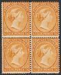 1891-1902 QV 6d orange-yellow positional blk of 4, wmk Crown CA reversed, positions 26, 27, 36, 37 with annotated characteristics. VF fresh 3M/1MUH, 1 tiny thin. Scott 16 cat US$220 as singles. SG 33x cat £360 for singles plus premium for positional blk. (P)