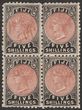 1881-99 QV 1/- brown blk of 4, perf 11 x 11¾. Superb fresh MUH. Scott 44 cat US$240 for M singles. SG 67a cat £260 for M singles, should be at least double, £520 MUH, plus premium for blk. Beautiful quality multiple. (P)