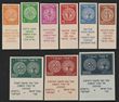 1948 1st Coin (Doar Ivri) set 3m-50m, 250m, 500m & 1000m, all IMPERFORATE, all with FULL TABS. Superb fresh MUH appearance, lower vals pristine never hinged original gum, top 3 vals expertly regummed, all 4 nice large even margins (the imperfs of the top vals basically do not exist perfect MUH, as they were discovered in poor condition, so exist either as MUH with spots, or as no gum or as regummed, & therefore should be accepted as usual condition for these). Bale 1-9TAB-Imp cat US$15,500 net retail valuiation. SG 1-9TAB(var) cat £8000 as perf normals & calculating the x 2.5 times premium for imperfs one arrives at est cat £20,000+. Very rare genuine set as only several imperf sheets existed of the top vals & there were only 10 stamps with tabs per sheet. One of the key rarities of Israel philately. 2019 Ceremuga photo-certs for all. (9) (P) |