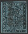 Parma: 1852 Arms 40c black on pale blue. VFU, 4 margins. Scott 5 cat US$550, SG 8 cat £1000. Sass 5a cat €1800. (P) |