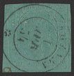 Sardinia: 1853 King Embossed 5c blue-green, on coloured paper. F-VF U with '1 Apr 54' cds, 3½ margins. SG 9 cat £1400. Sass 4 cat €2500. Rare genuine. (P) |