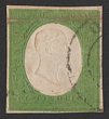 Sardinia: 1854 King Embossed 5c yellow-green. VFU appearance, horiz crease at top, 4 large margins. Scott 7 cat US$575, SG 13 cat £900. Sass 7 cat €1200. Rare genuine. (P) |