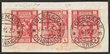 Libya: 1924 Pictorial 2L red perf 13½ LL cnr strip of 3, error outer stamps IMPERF, with vertical perfs on central stamp & imperf horiz at base & UL. VFU, 'Tokemaide Cirenaica 24 12 39' cds. SG 45(var). Sass 43ga + 43 cat €2000+, see footnote cat €6500. Great rarity as only 1 column believed to have existed. Raybaudi photo cert. (P) |