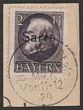 1920 Saare bars opt Bavaria 15c 'lebhaftkarminrot' error opt shifted, leaving 'BAYERN' not obliterated. VFU, St Ingbert cds. SG 20(var) cat £33+. Mi 20(var) cat €30+ -both, plus premium for opt shift. (P)