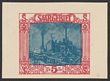1921 Pictorial 25Mk blue, black & red on chalk surfaced thin card progressive imperf PLATE PROOF prs in blue, blue & red, & completed design - the last printed on back of magazine page. SG 68(p). Mi 69PI, 69PII & 69PIII. Listed but unpriced, while would cat €3600 as normals imperfs. Very rare. Exp Dr Dub, plus 2024 Ceremuga photo-cert. (6). (P)