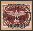 Latvia-Kurland: 1945 opt 'Kurland 12' on red-brown Eagle perf Fieldpost Parcel Stamp, error opt shifted so box of dots at base & '12' at top. VFU, tied to piece by 'Liepaja Latvija 20 IV 45' cds. SG 4A(var). Mi 4A(var) cat €90++, plus large premium for rare error. Exp van Loo BPP, plus 2024 Ceremuga photo cert. (P)