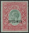 1912-21 KGV 500R green & red/green, opt SPECIMEN. VF fresh MLH with bright colours. Scott 59a cat US$1400. SG 63s cat £1600 (normal cat £45,000). Rare top value. (P) |