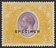 1922-27 KGV £3 purple & yellow, opt SPECIMEN. VF fresh M. Scott 39s cat US$475. SG 97s cat £475 (normal cat £1800). (P) |