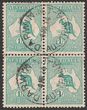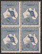 1/- Blue Green blk of 4. F-VFU, tiny tear on left, Darwin 4 MR 14 cds. SG 11a cat £120+++. ACSC 30c cat $200+++. (4). (P)
