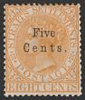 1880 '5 cents' opt QV 8c orange opt SG type 14. F-VF UN. Scott 31 cat US$210. SG 42 cat £225. Only 5 rows of 10 of this type per sheet. (P) |