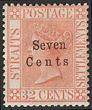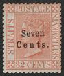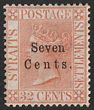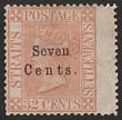 1879 'Seven Cents' opt QV 32c pale red, variety No Stop after 'Cents' F-VF fresh M, positional gum. Scott 21a cat US$1800. SG 21a cat £1800. Very rare variety occurred only once in the setting & certificate can be obtained on request. (P) |