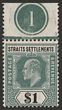 1904-10 KEVII $1 dull green & black on chalk-surfaced paper, wmk Mult Crown, top marginal with plate no 1. Stamp VF fresh MUH. Scott 123 cat US$75 for M. SG 136b cat £70 for M, should be at least double £140 MUH plus premium for plate no. (P) |