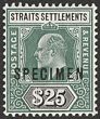 1904-10 KEVII $25 grey-green & black, wmk mult crown, opt SPECIMEN. Superb fresh MUH, pristine never hinged original gum. SG 139s cat £500 for M, should be at least double, £1000 MUH (normal cat £3500 M, £7000 MUH). (P) |