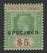 1912-23 KGV $5 green & red on emerald back, Die II, opt SPECIMEN, wmk mult crown. VF fresh MLH. SG 212ds cat £140. (P) |