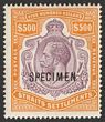 1906-12 KEVII $500 purple & orange, opt SPECIMEN. VF fresh MLH with nice original gum & beautiful deep colours. Scott 146s cat US$4500 (normal cat US$175,000). SG 169s cat £5000 (normal cat £200,000). Very rare top value & certificate can be obtained on request. (P) |