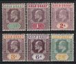 1904-06 KEVII ½d to 2/6 (ex 2½), wmk Mult Crown. VFM. Scott ex 49-55 cat US$146. SG ex 49-57 cat £173. (6)