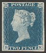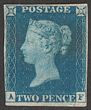 1840 QV 2d blue to bright blue, no lines, plate 1, letters AF. VF fresh UN, 4 margins, beautiful bright colour. SG Spec DS5/DS6A cat £38,000/£45,000, SG 5-PL1 cat £38,000. Very rare in genuine unused condition & certificate can be obtained on request. (P) |