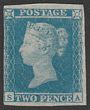 1841 QV 2d violet-blue white lines, letters SA, Plate 4, variety strong 'ivory head', paper with sl sign of lavender tint. VF fresh UN, 4 margins (3 large & 1 close but clear at left). SG Spec ES17 cat £9,000 for this shade/paper combination. SG 14/15aa cat £5000 as cheapest blue shade & cat £22,000 for violet-blue on strongly lavender tinted paper. Significant rarity. (P) |