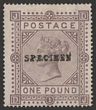 1867-83 QV £1 brown-lilac, wmk Maltese Cross, white paper, opt SPECIMEN SG type 9 (14¾x1¾-2mm). VF UN, nice colour. SG Spec J127u. SG 129s cat £6250 (normal cat £75,000). Rare top value. (P) |