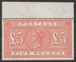 1867-83 QV £5 orange, letters DH, white paper. Stamp is superb fresh MUH, pristine never hinged original gum, intense bright colour. Scott 93 cat US$14,500 for M, SG 137 cat £12,500 for M, should be at least double, £25,000 MUH. Very rare mint as few people could afford to keep a £5 stamp in their collections in those times (5 gold sovereigns!). Major rarity in such pristine MUH quality & stunning example of this key stamp. Certificate can be obtained on request. (P) |