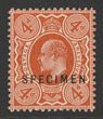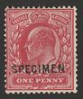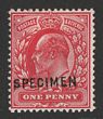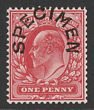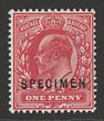 1902-10 KEVII 1d scarlet opt SPECIMEN (SG type 15). F-VF fresh M, sl cnr thin. SG Spec M5s, SG 219s cat £250. (P) |