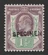 1902-10 KEVII 1½d purple & green DLR printing ordinary paper opt SPECIMEN (SG type 15). VF fresh M. SG 221s, SG Spec M8s cat £275. Very scarce. 2021 Ceremuga photo cert. (P) |