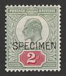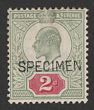 1902-10 KEVII 2d yellowish green & carmine-red opt SPECIMEN (SG type 16). MLH, tear at top. SG Spec M11s, SG 225s cat £550. Quite rare. (P) |