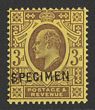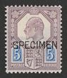 1902-10 KEVII 3d deep purple on yellow, DLR printing ordinary paper, opt SPECIMEN. (SG type 15). VF fresh M. SG 232bs, SG Spec M19s cat £350. Quite rare. 2021 Ceremuga photo cert. (P) |