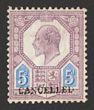 1902-10 KEVII 5d dull purple & ultramarine chalk-surfaced paper, DLR printing, opt CANCELLED (SG type 20) being special specimen ex DLR archives. Superb fresh M. SG 242a(s)(var). SG Spec M29u cat £2000. Major rarity as only several recorded. 2021 Ceremuga photo cert. (P) |