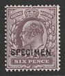 1902-10 KEVII 6d slate-purple DLR printing, ordinary paper, opt SPECIMEN (SG type 22). VF fresh M. SG 246s, SG Spec M33s cat £400. Quite rare. 2021 Ceremuga photo cert. (P) |