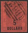 1891 '5 DOLLARS' opt QV Stamp Duty $10 purple & red, Postal Fiscal. Postally VFU, barred oval 'B62' pmk. Scott 60 cat US$140+. SG F9 cat £130+. (P)
