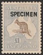 £1 Brown & pale blue opt SPECIMEN, type B. Well centred, slightly darker gum. SG 44s(var). ACSC 52Dx cat $1000. (P)