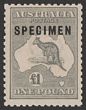 £1 Grey opt SPECIMEN type C2 with 'shaved P'. VF fresh M. SG 75s. ACSC 53Axf cat $1000. (P)