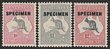 SPECIMEN set opt Type D, 10/- grey & pink, £1 grey & £2 grey black & crimson. VF fresh MUH. SG 136s-138s cat £90. ACSC cat $535. (3). (P) |