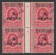1919 '4 cents' opt KGV 6c scarlet, gutter blk of 4, with SPECIMEN violet h/s local opt type K3 (22x2.5mm), which was used for presentation sets (instead of the black DLR type opt used for UPU distribution). VF fresh MUH. SG 64s(var) cat £260+ for M singles, should be at least double, £520+ MUH, plus premium for the rare violet opts. Extremely rare multiple & certificate can be obtained on request. (P)