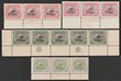 1916-32 Bicolour Lakatoi ½d to 10/- imprints & Monograms strips of 3 with blks up to 10 inc shades 2d deep brown-purple, 4d light brown & orange, 2/6 both shades inc wmk variety 'grown to right of A' on 1d grey-black & carmine, 2d deep brown & purple (SG 96aw), 4d light brown & orange (SG 99aw) inc Harrison, Mullett & Ash imprints as applicable, Cooke JBC & CA Monograms & finally 1932 Ash printing on 9d & 1/3. Some mixed condition but some tropicalisation. Generally F-VF MLH/MUH. SG 93-105, 127-28 cat £2100 as normal, should be at least double for imprint/Monograms £4200+ = A$8400+. Very rare assembly, very difficult to duplicate. (162) (P) |