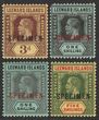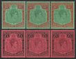 1912-22 KGV 3d purple/yellow on white back, 1/- black/green on white back, 1/- black/blue-green, olive back & 5/- green & red/yellow on white back, wmk mult crown, opt SPECIMEN. VF fresh M, one 1/- blunt cnr. SG 51as, 54as, 54bs, 57as cat £280. (4) (P)