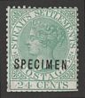 1867-72 QV 24c blue-green wmk crown CC, opt SPECIMEN sans-serif opt type D11 (15x3). F-VF UN. SG 16s cat £250 as normal. Ex DLR archives & extremely rare or possibly unique. (P)
