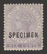 1883-91 QV 6c lilac, wmk crown CA, opt SPECIMEN sans-serif opt type D11 (15x3mm). F-VF UN. SG 66s. Ex DLR archives & extremely rare. (P)